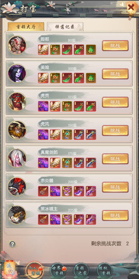 2、打宝方式:于游戏主界面右下角点击“激战BOSS”,即可进入打宝界面。在该界面中,战胜江湖里的各路首领大盗,便有机会获取各类高级装备。
