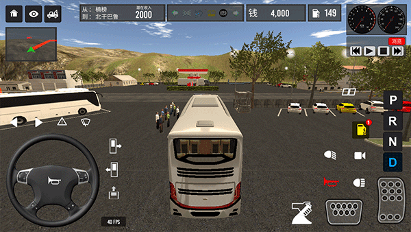 3、方向盘位于左边,用于操控方向。右下角依次是“手刹”“刹车”以及“油门”。仪表盘、油量显示和金钱数额在右上角。最后,挂上“D”挡,就能启动你的公交车了。