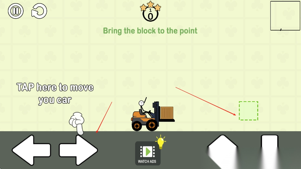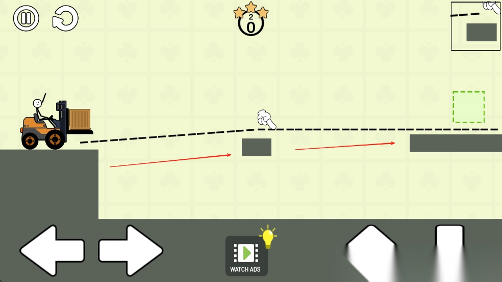 1、进入游戏后查看关卡中小车与终点的位置,在屏幕上绘制虚线路径,为小车规划行驶路线。