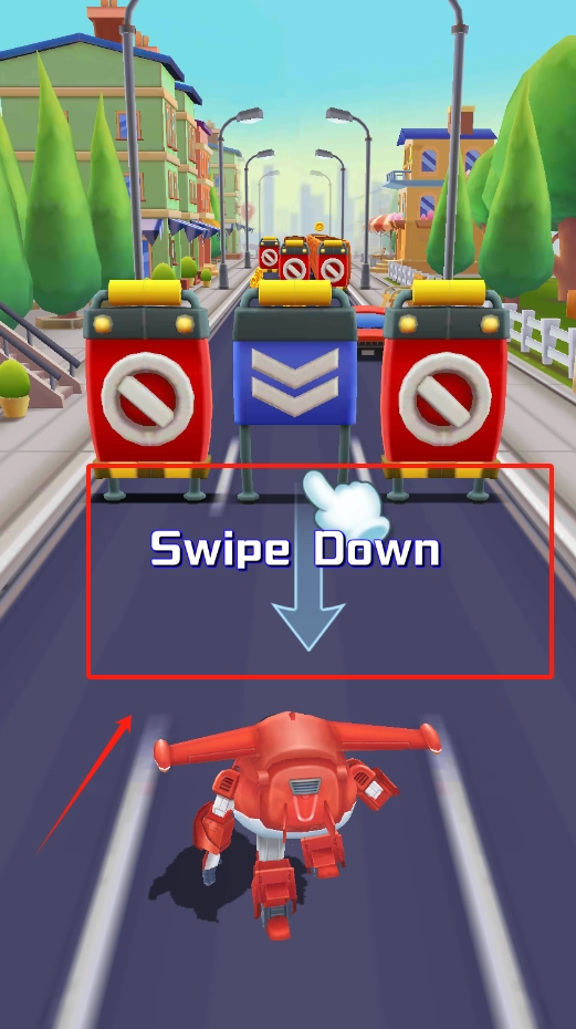 1、滑动屏幕控制方向,左右移动避开红色蓝色障碍物,保持飞侠平稳前进。