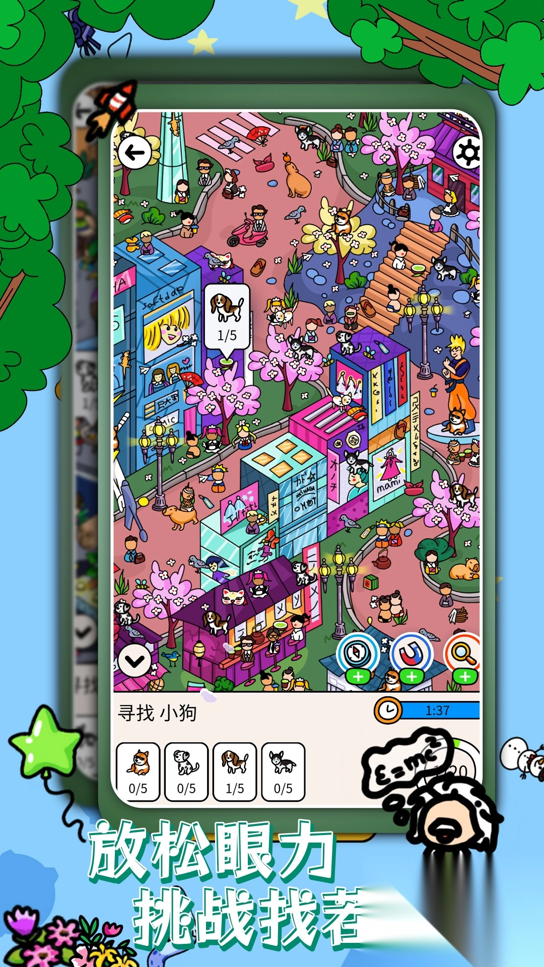2、请集中注意力,在画面里找出特定数量或特定类型的不同点,比如寻找小狗,或者收集全部的花等等。