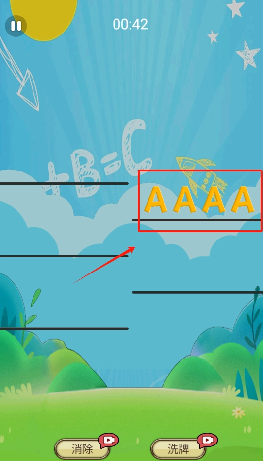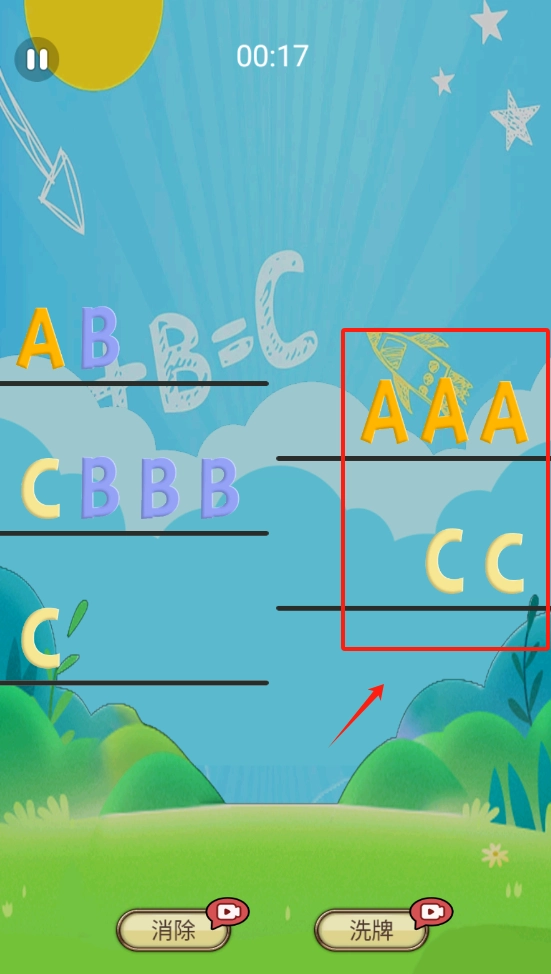 2、看到右侧三个黄色A字母,点击消除按钮就能把它们消掉得分哦。