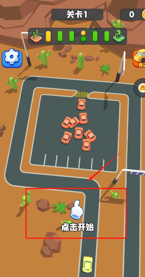 1、看到点击开始白色手指图标,点红框里的这个按钮就能进入沙漠停车场关卡开始游戏啦。