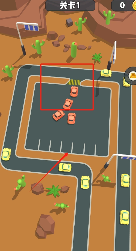 3、瞧见红框标出的空停车场和箭头指示,按箭头方向滑动屏幕把黄色小车开进停车场就行啦。