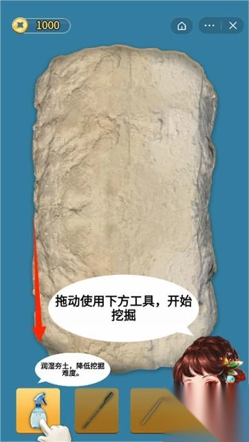 3、进入挖掘界面,拖动工具,清理石块,逐步发掘隐藏的青铜器文物。