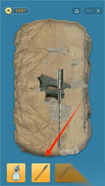 2、按提示使用工具,先润湿土方,再挖掘,清理石块,露出完整青铜器。