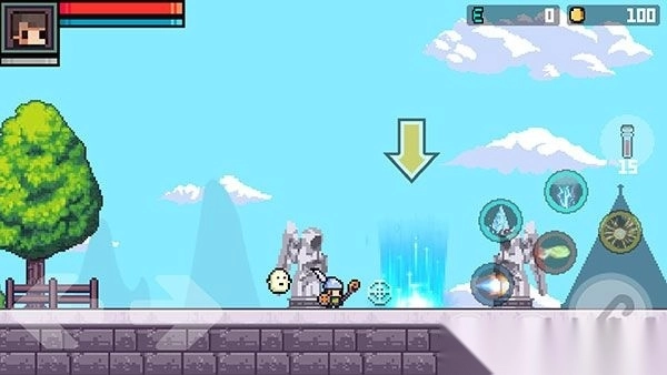 3、然后进入城镇,根据箭头的指引前往光柱处,点击普攻按钮即可开始冒险。
