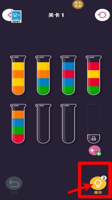 2. 轻点右下角的“提示”灯泡图标,就能获取当前关卡的提示,助力玩家迅速梳理清楚颜色排序的思路。