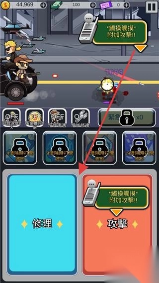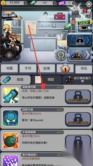 2. 在技能界面,对“电动按摩枪”进行升级,从而触发“停止所有扰民行为!逃离危险”这一效果,以此来应对罪犯的骚扰,守护警局。