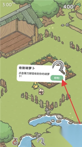 2、收到“收割胡萝卜”任务,点镰刀按钮,收割成熟作物,获取资源,用于种植升级、兑换道具。