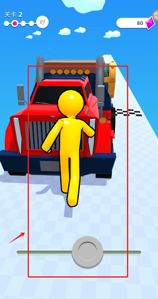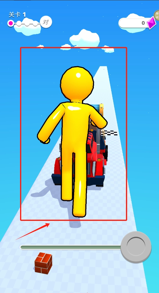 2、拖动屏幕下方砖块或圆形物体,帮助黄小人站在红色车辆旁边完成关卡任务。