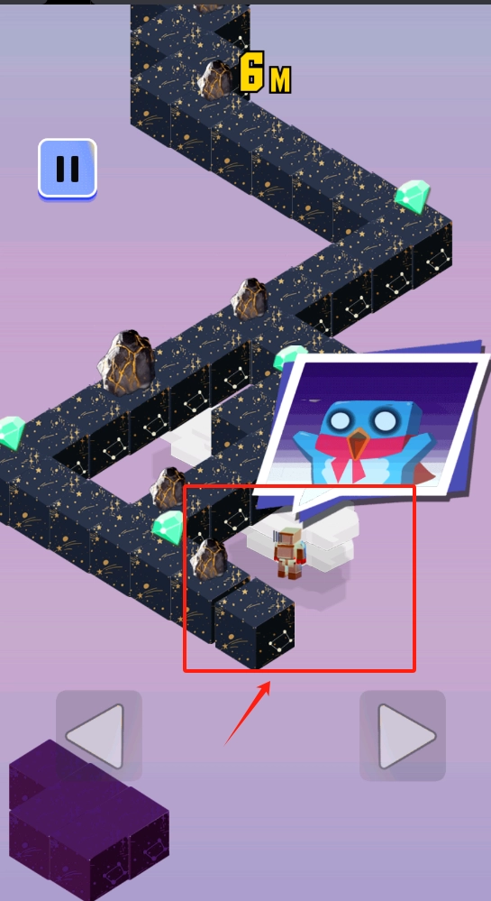 2、点击左右两侧的操作按钮控制小人移动,收集绿色宝石,避开石块,到达6米终点。