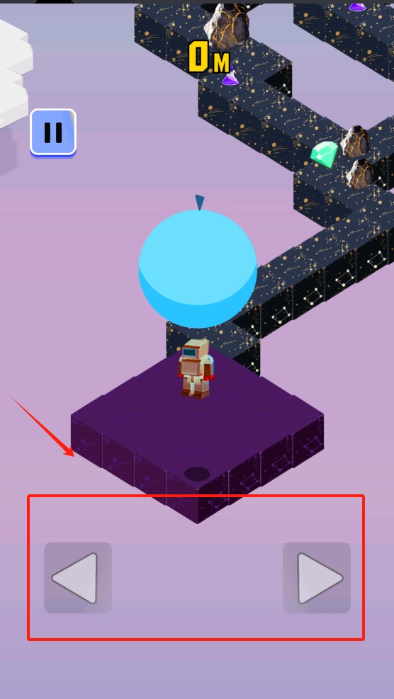 3、点击底部左右箭头按钮控制宇航员移动,收集蓝色球体和宝石,注意避开障碍物。