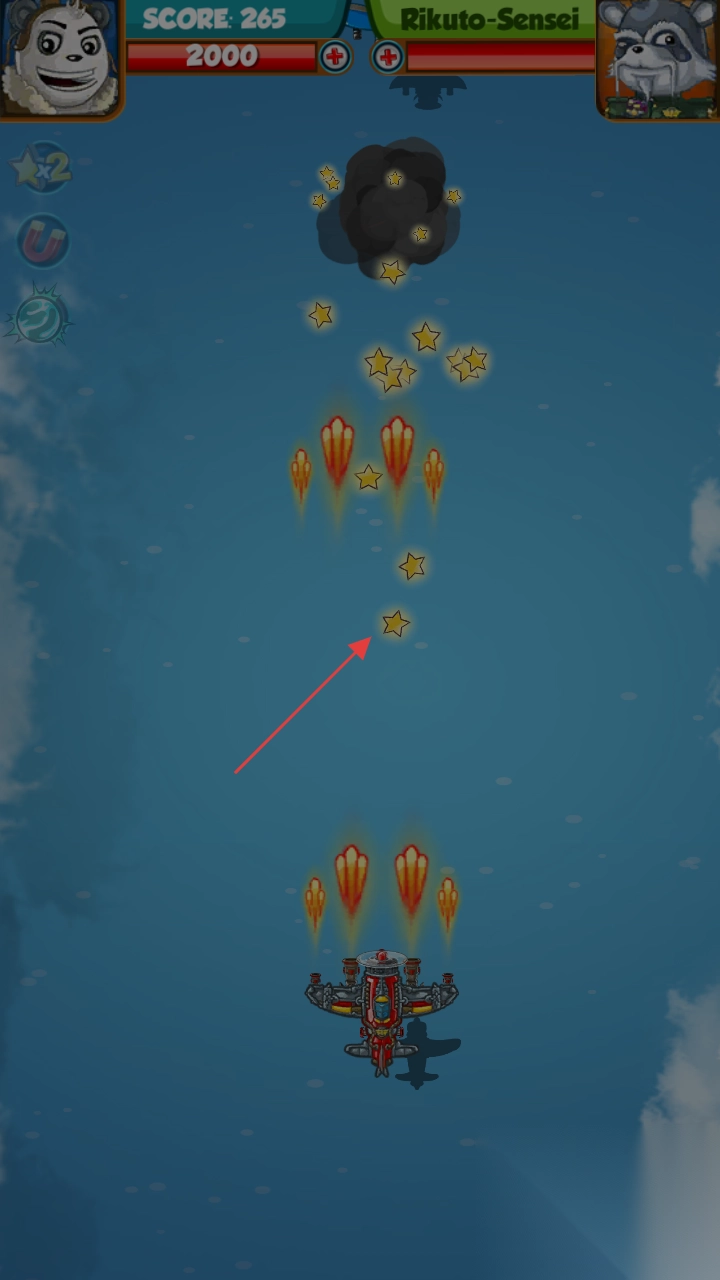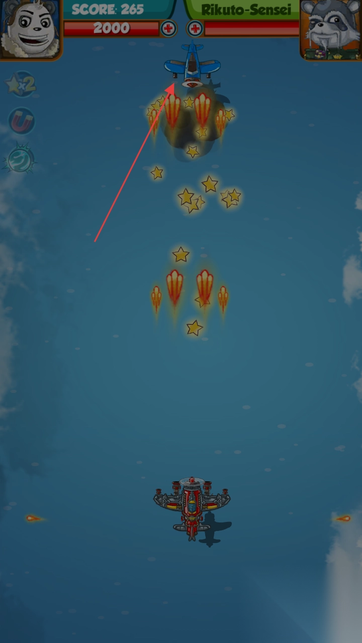 2、飞行中遭遇敌方飞机,通过灵活移动、利用道具(磁铁等),争取高分(SCORE)。