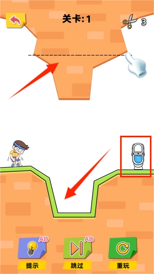 3、砖块掉落,大坑被填补,孩子顺利找到了马桶,恭喜你过关,可以挑战下一关了。