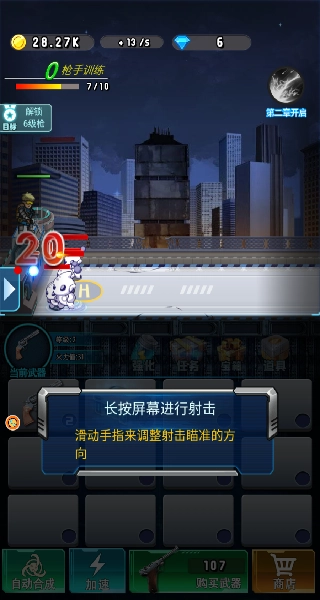 4、操控主角,长按屏幕进行射击,面对僵尸来袭,持续开枪以消灭它们。