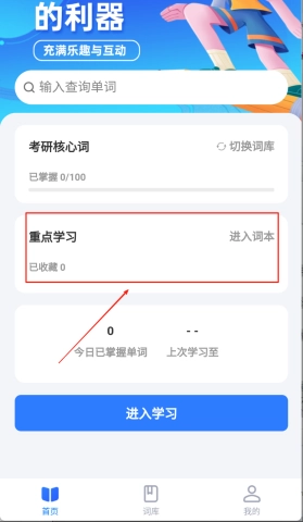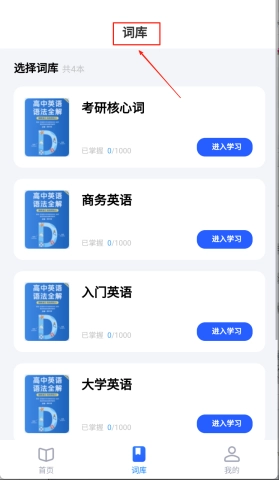 1、首先点击首页的词库标签,根据自己的需求选择中考、考研等分类词书,开始你的学习之旅。面对海量词汇,你就像选择角色一样,启动自己最强的学习模式!