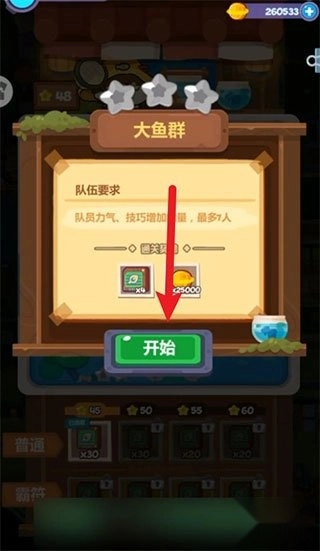 2、进入大鱼群场景后,点击界面右下方显眼的"出发"功能按钮。
