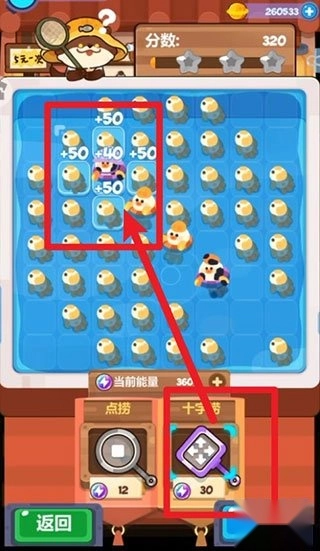 3、开启底部工具栏的“十字捞”功能,精确点击鱼池里游动的鱼群来实施捕捉。