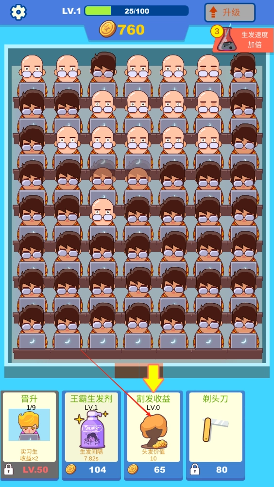 1、滑动屏幕点击头顶头发的程序员们,收割他们的头发资源,积累金币,用于升级下方功能 。