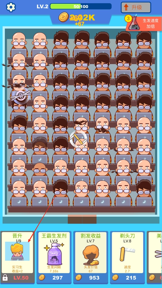 2、赚取到金币之后,用金币升级 割发收益,王霸生发剂 等项目,提升头发的产出速度、收益价值。