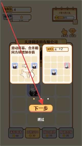 2、按指引滑动合并相同方块,提升市值,点击【下一步】,推进教程,熟悉“合并升级”核心玩法,积累初始资源。