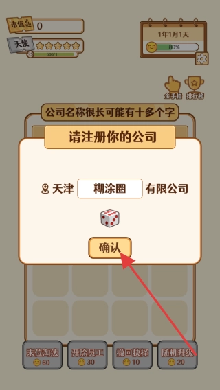 1、开局注册公司,确认“天津糊涂图有限公司”名称,点击【确认】,完成企业创建,开启创业流程。