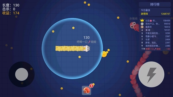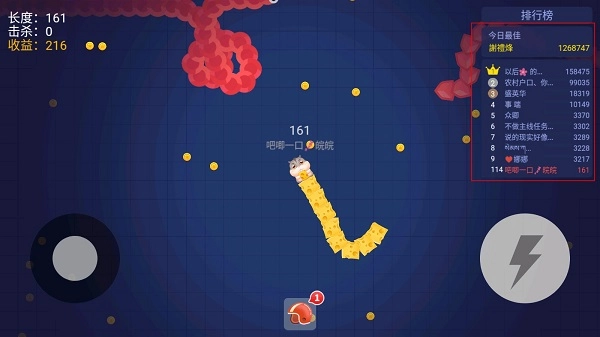 1、控制摇杆走位,吃掉地图上金币,就会变长。