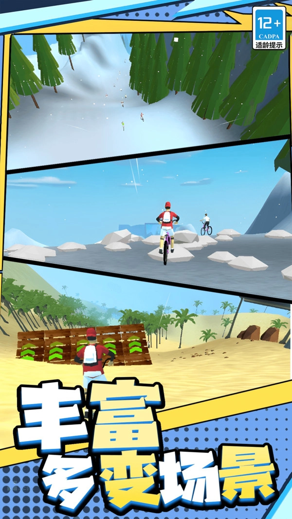 1. 挑选赛道与车手,切换至第一视角开启骑行之旅。通过滑动屏幕掌控方向,巧妙躲避障碍、超越对手,全力冲向终点。
