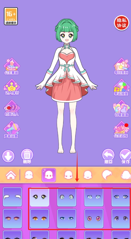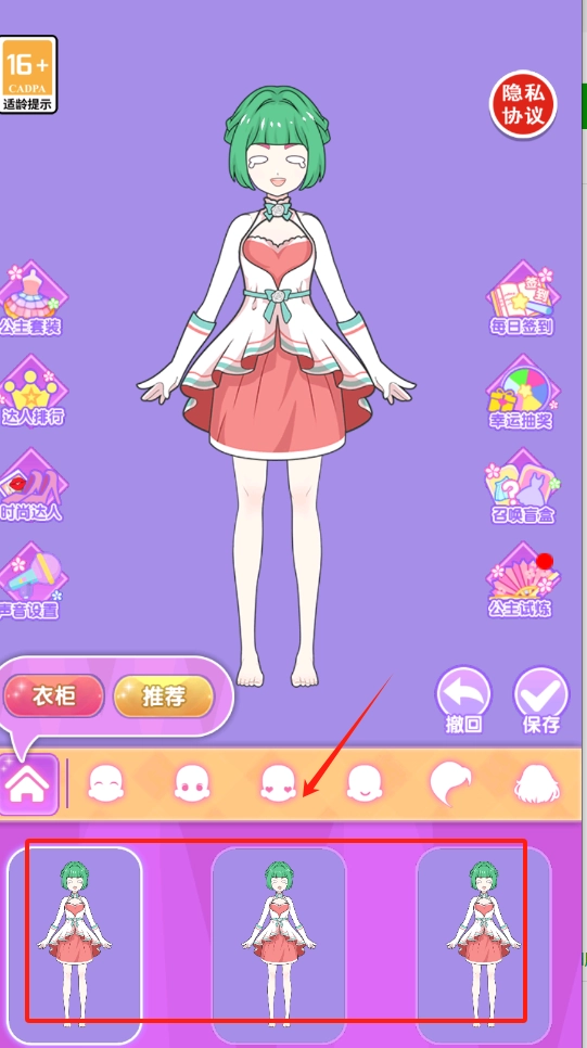 2、选绿发女孩,从左边挑公主套装,右边设置,下方调发型眼睛再保存。