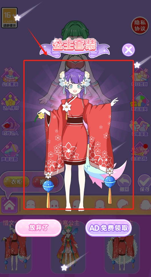 3、给红发和服女孩换装,点公主套装选项,底部可放弃或免费领取AD。