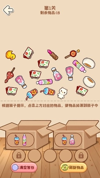 2、根据箱子的提示,点击上方对应的物品,让物品掉落到箱子里面。