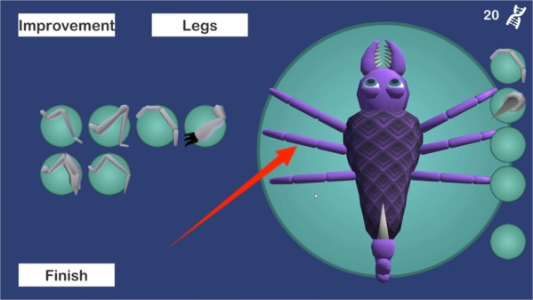 3、进入改造界面,选腿部等部件,消耗DNA,升级昆虫,增强战斗能力。
