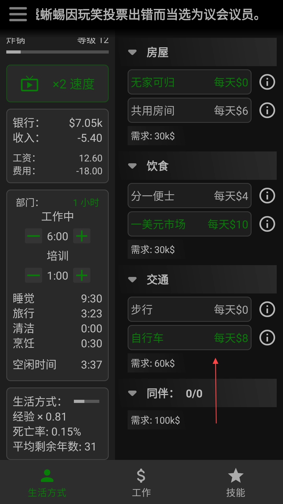 2、点击生活方式,我们可以控制角色的每日的饮食出行等。