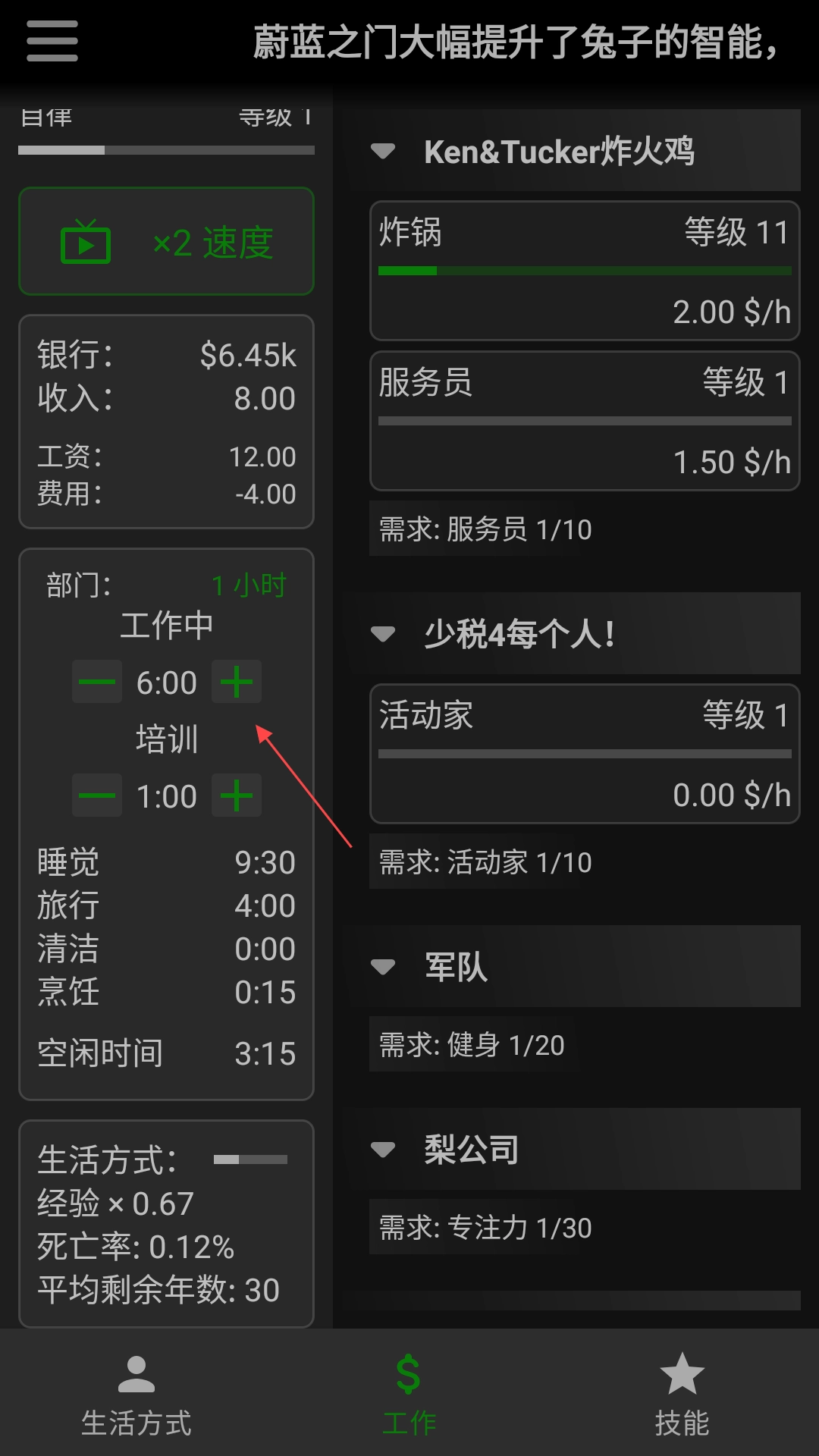 1、进入游戏后,我们可以调整工作时间和培训时间来获取金钱。