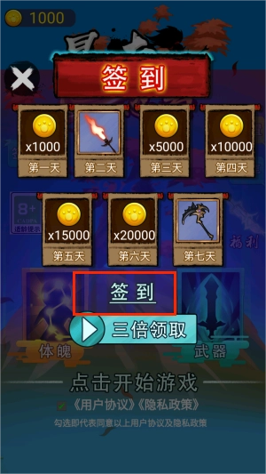 1、进入游戏后,可以先点击“签到”,领取奖励,连续签到奖励更多。