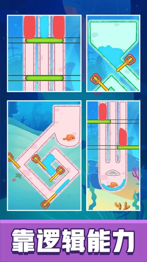 3、益智闯关模式。借助推箱子、触发开关等手段,为小鱼开辟通路。关卡设计独具匠心,得经过多次尝试,方能寻得最优解。