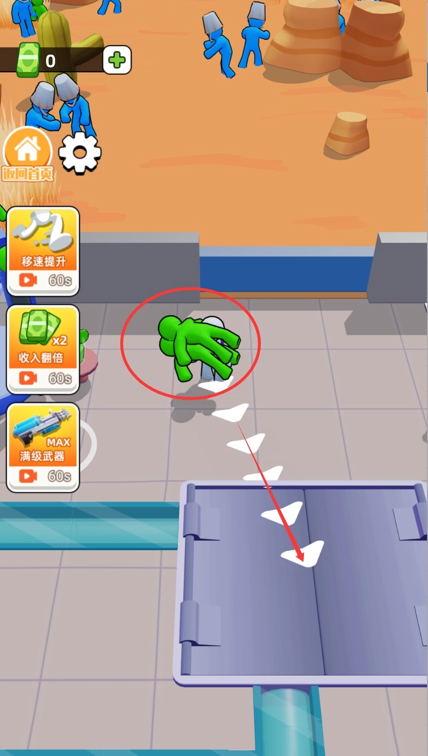 1、僵尸捕捉环节,使用升级后的装备在关卡中捕捉僵尸,不同等级的枪械对应不同体型的捕获对象。