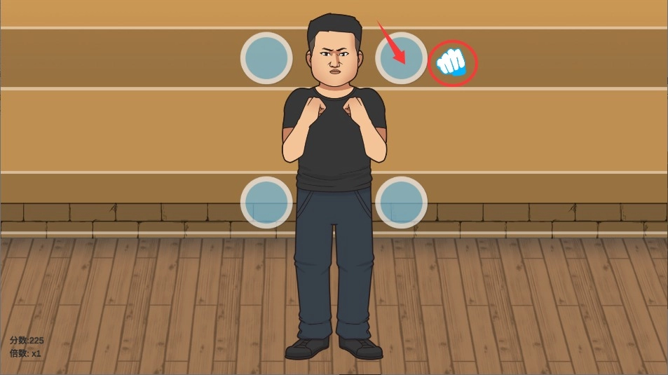 1、进入游戏后点击开始按钮,观察屏幕上摇摆拳头的运动轨迹,把握最佳出手时机。
