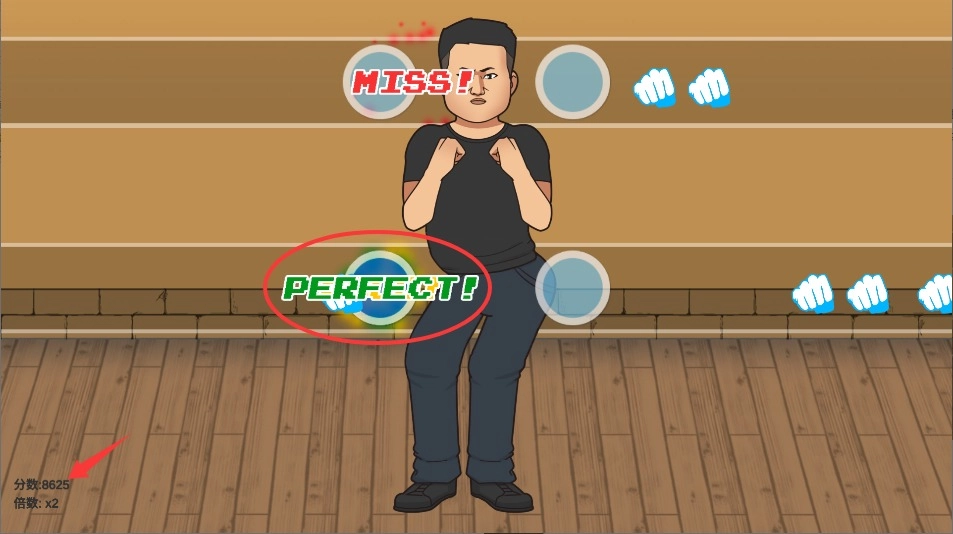 2、当拳头摆动到目标框范围内时快速点击屏幕,精准命中可获得完美击打判定效果。
