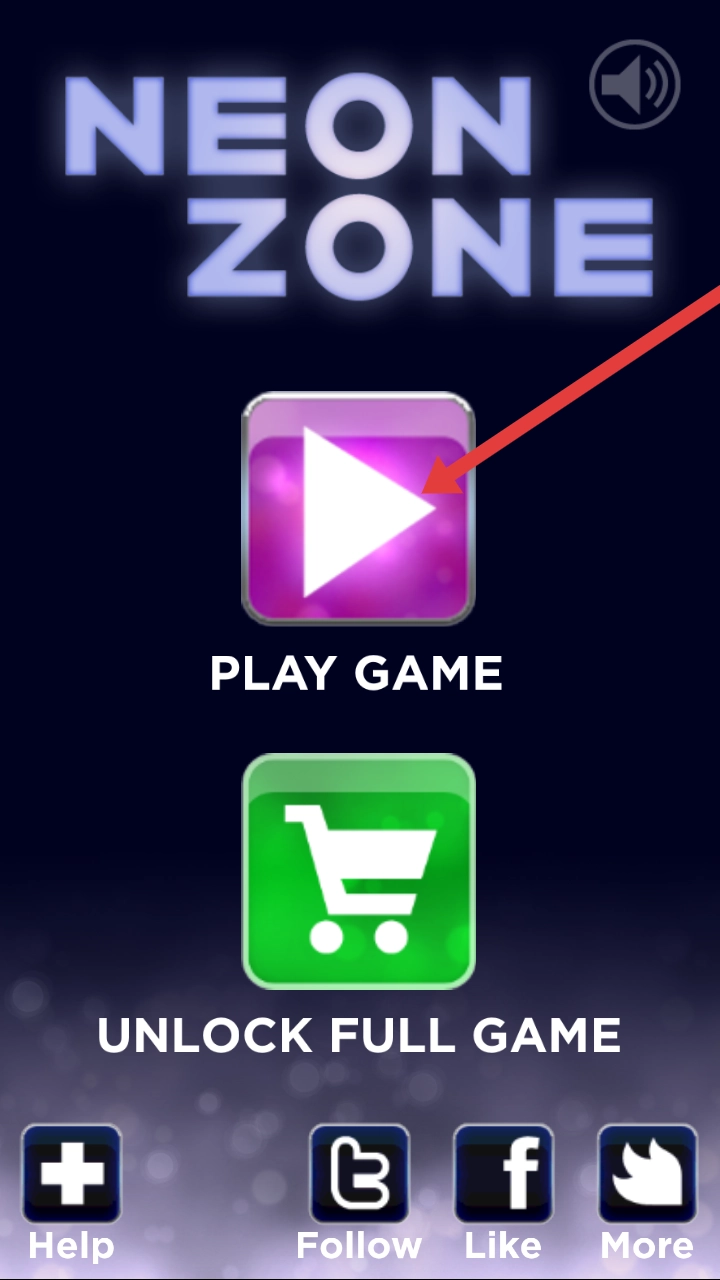 1、进入炫光地带游戏主界面,点击箭头指向的紫色【PLAYGAME】按钮,正式开启霓虹主题的闯关之旅。