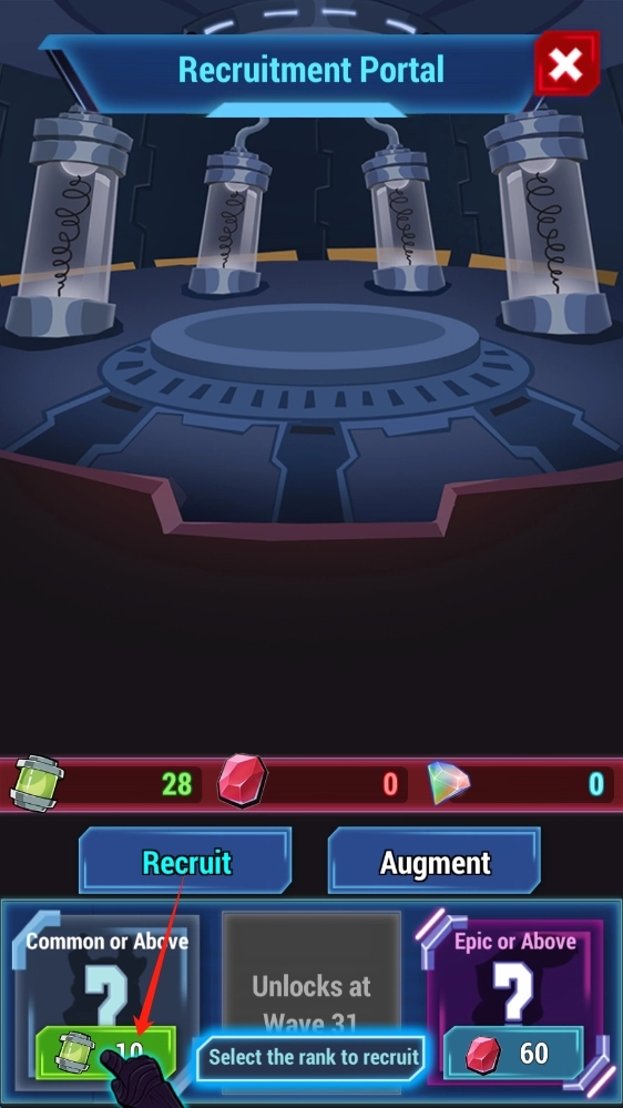 1、在Recruitment-Portal招募界面,点击Recruit,消耗资源,招募新角色,壮大队伍,点击购买物品。