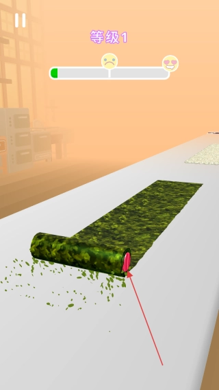 3、顺利卷成寿司卷后,借助出现的刀具把寿司卷切开,完成寿司制作关卡的任务。