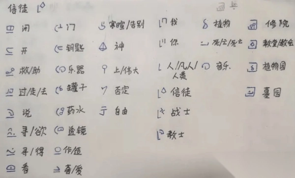 1. 信徒进入紫门,密码为“教士、看、瓶” 。