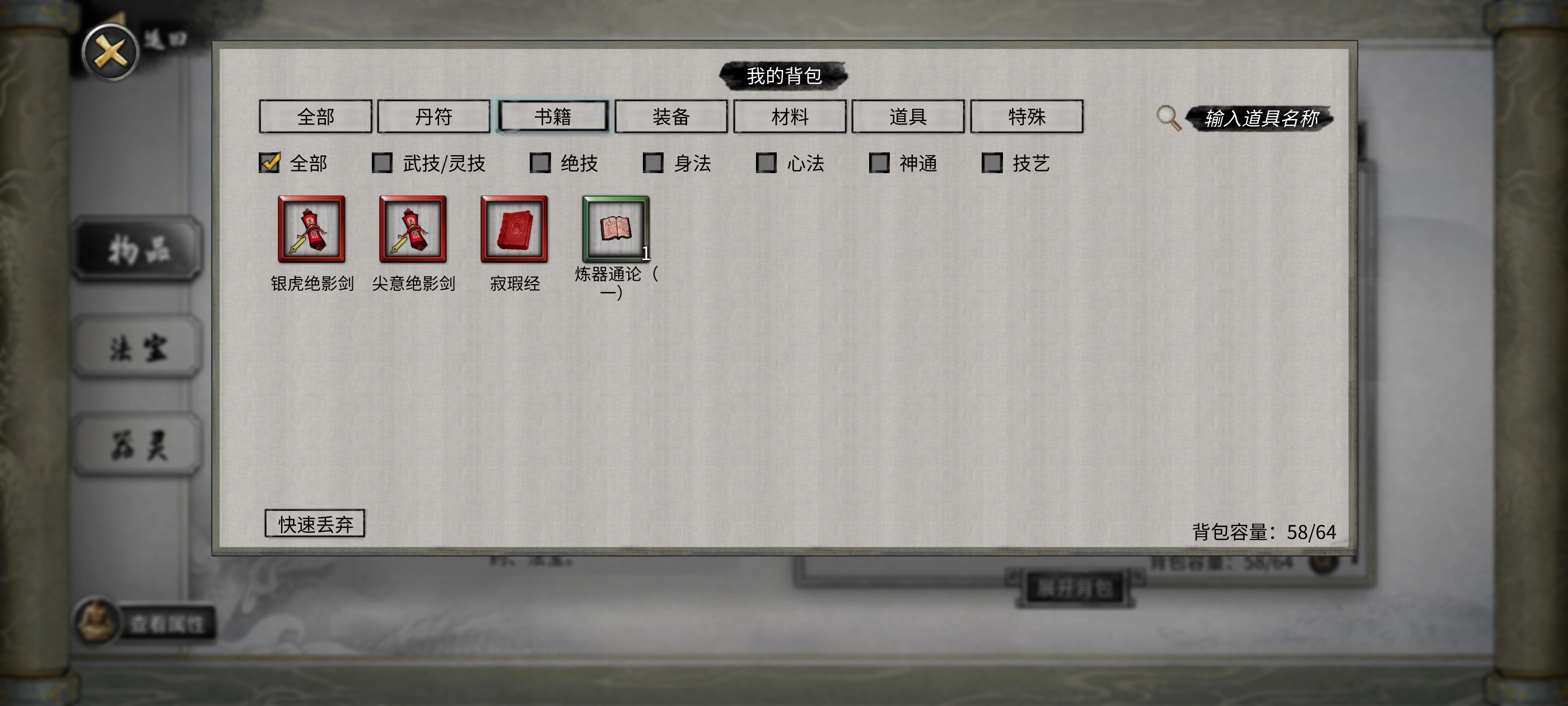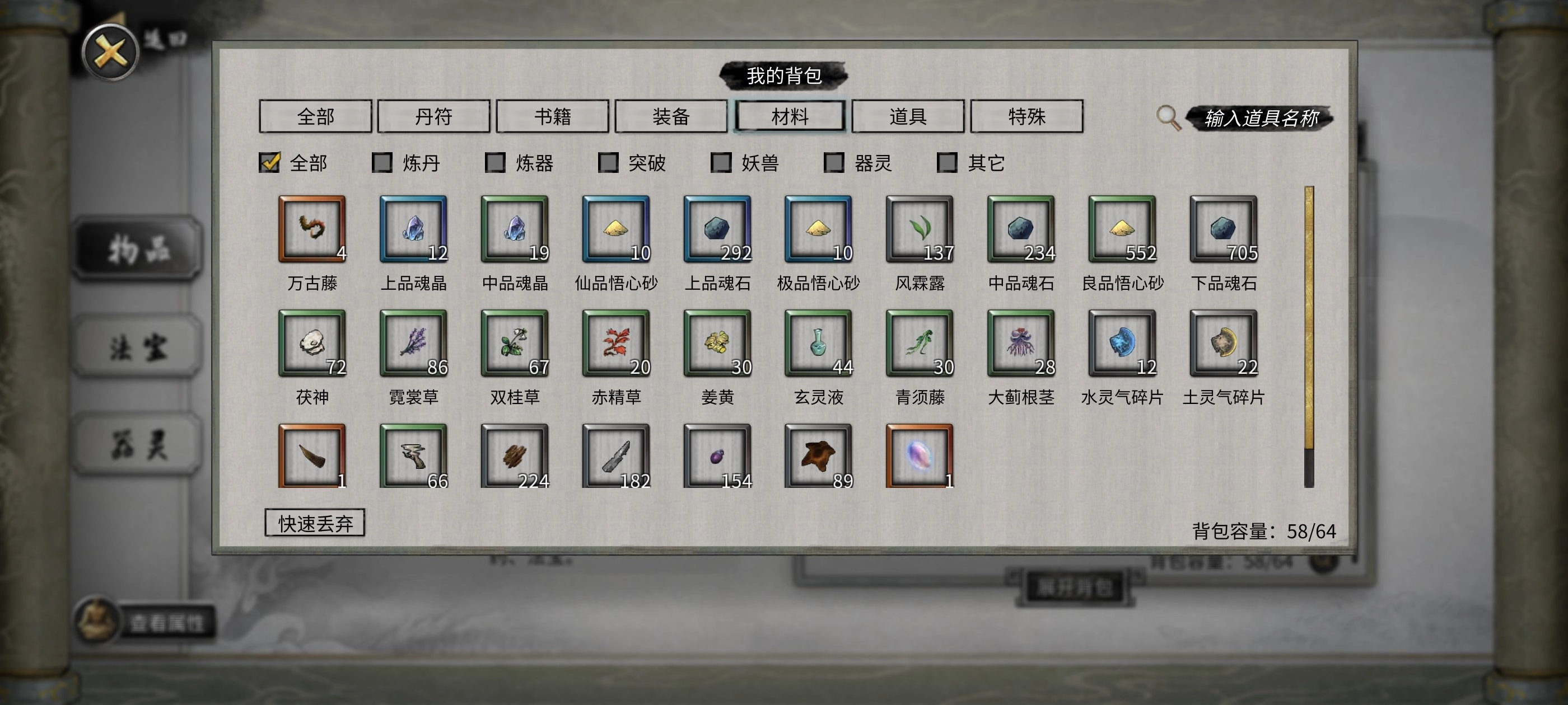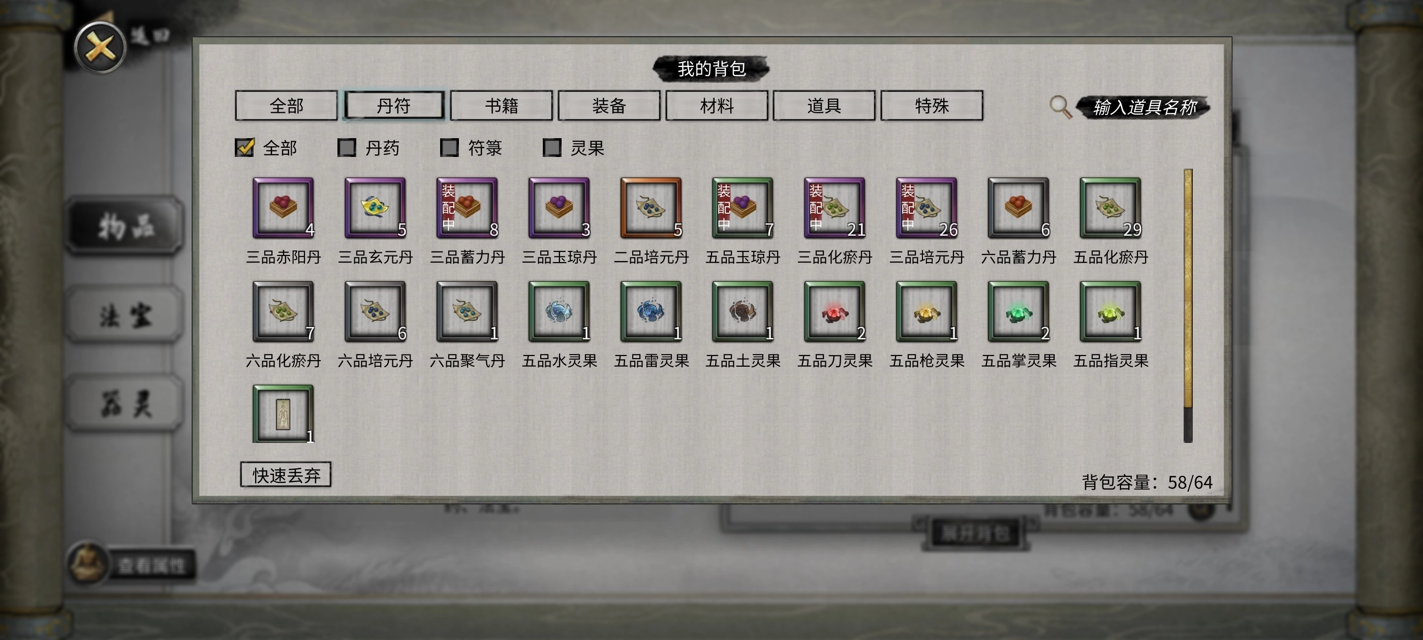 丹药:涵盖突破丹药,以及回血丹、回灵丹、元阳丹、还魂丹等(需注意,灵盾符同样被归类于丹药范畴)