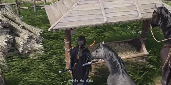 7、把这个萝卜递给小马,随后跟着它走到食槽这边,拿到祁民家驯的东西。