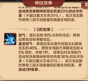 神技:神魔两斩(可为自身及全队带来增益效果,同时对敌方施加负面减伤状态,造成全场伤害并使其眩晕(神5))