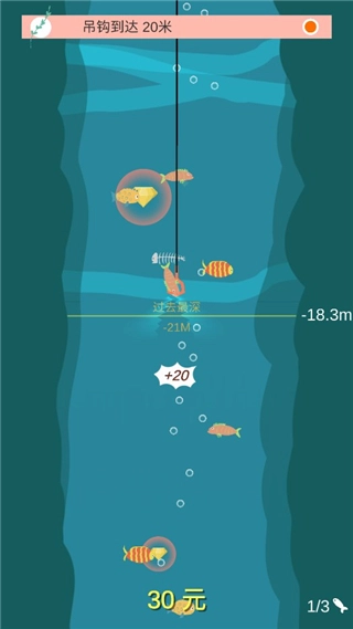3、钓饵下沉至特定深度时,便会收杆;要是碰到鱼,钓杆也会自动上鱼。
