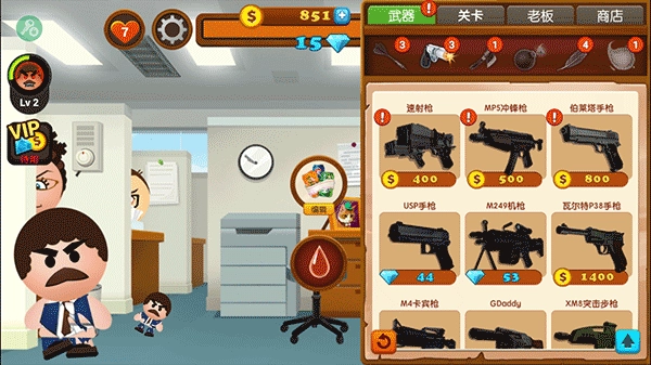 1、进入游戏后,玩家能够在游戏内对BOSS进行发泄,购买武器;