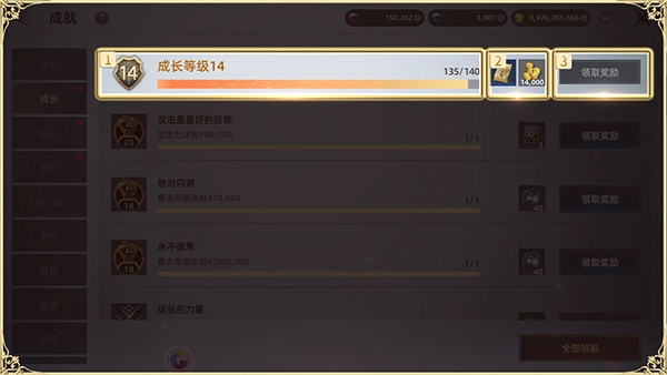 2、当达成成就目标后,领取奖励按钮会被激活,点击该按钮就能领取成就奖励。此外,也可点击右下角的全部领取按钮,实现一键领取奖励。